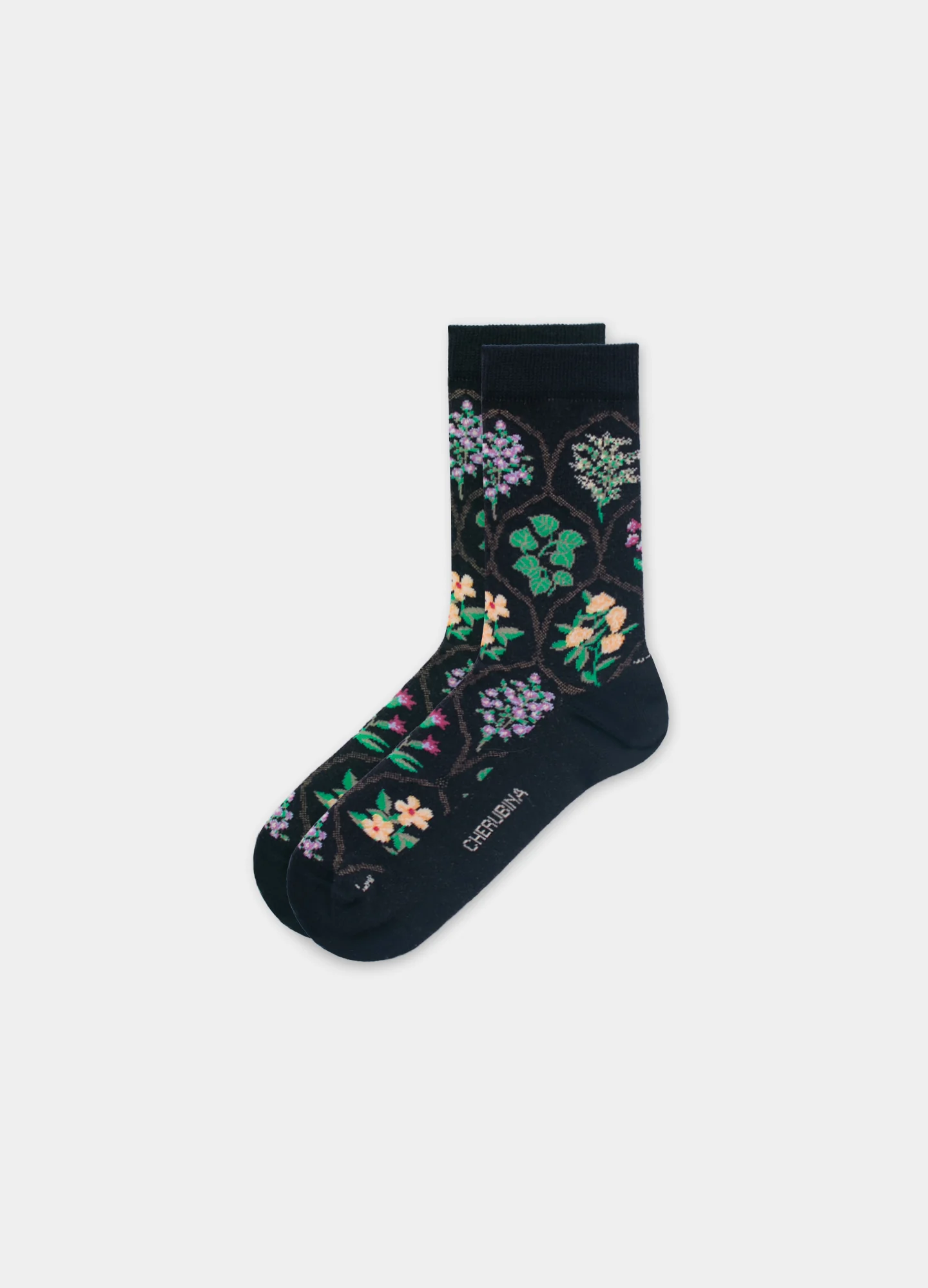 Son unos calcetines de algodón peinado cortos con diseño exclusivo Cherubina con motivo de vidriera con flores y hojas de diferentes tamaños. Con puño elástico sentitive, más cómodo. Realizados mediante un delicado proceso de tejido con 168 agujas y remallado a mano.