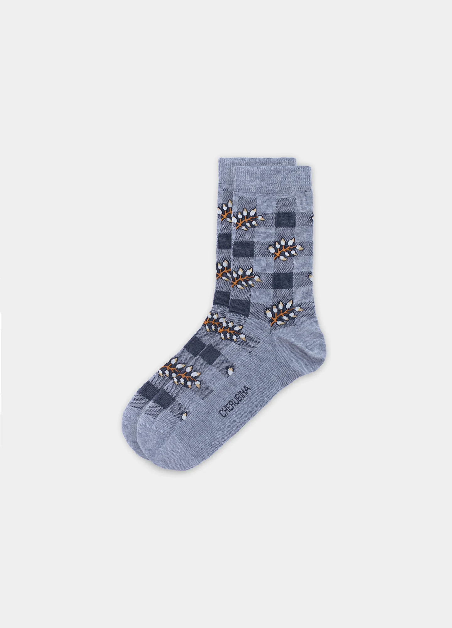 Son unos calcetines de algodón peinado cortos con diseño exclusivo Cherubina de cuadros vichy con motivo de hojas superpuestas. Con puño elástico sentitive, más cómodo. Realizados mediante un delicado proceso de tejido con 168 agujas y remallado a mano.