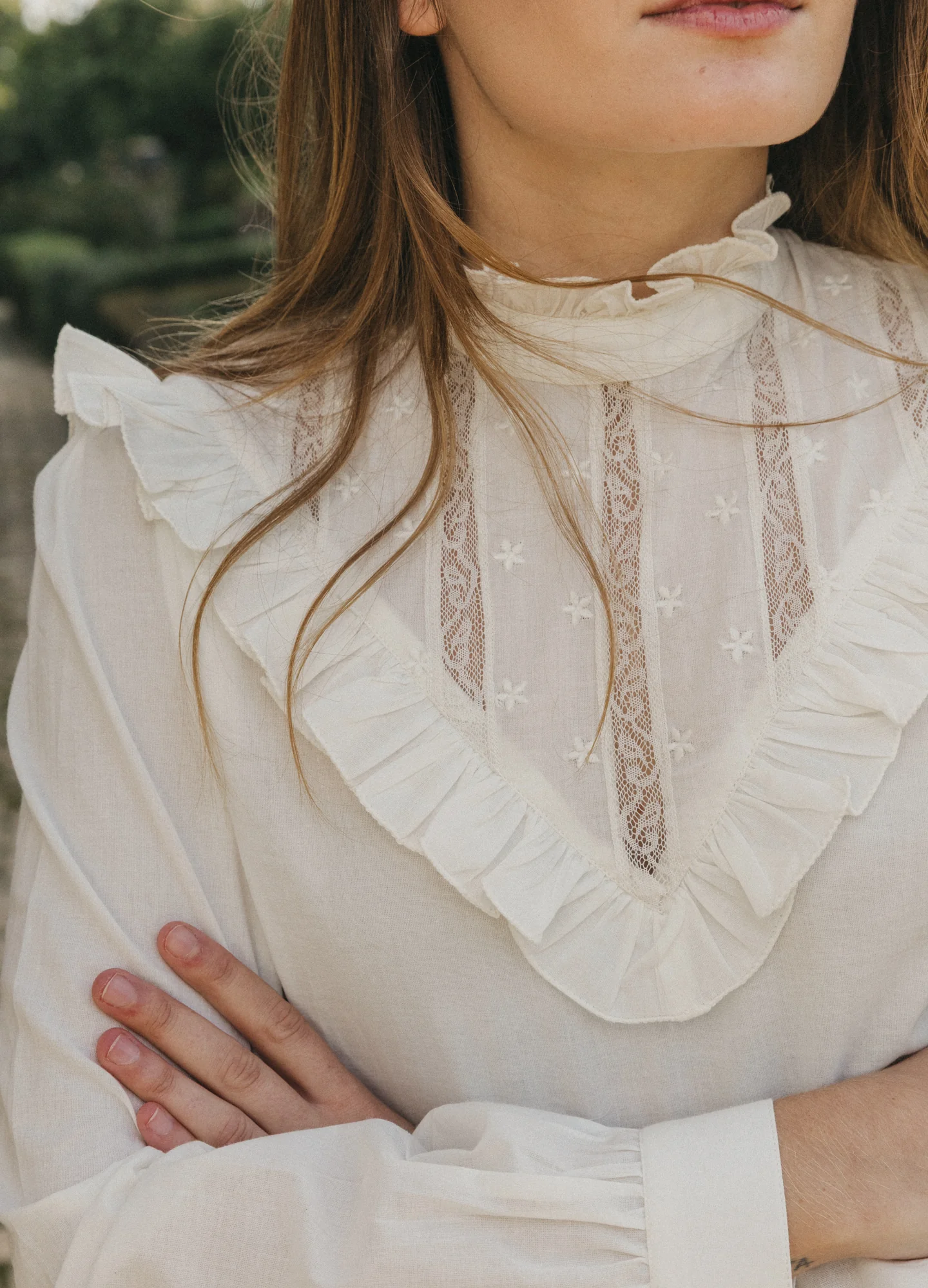 Blusa de voile de algodón de manga larga, con cuello caja y tirilla. Presenta babero frontal triangular con tiras bordadas al tono y volante del mismo tejido. Cierra en el centro de la espalda con botones de nácar.