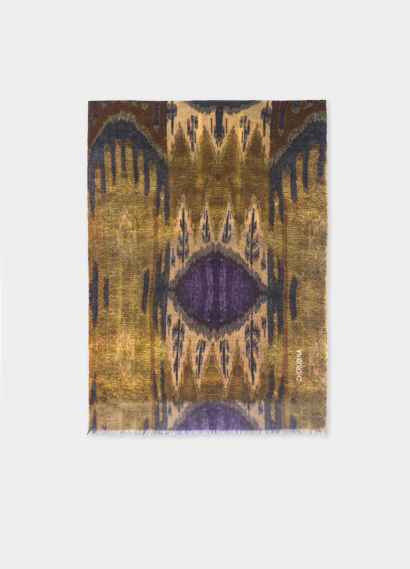 Es un chal rectangular 100% lana merino con un tacto suave y un diseño étnico, realizado mediante un delicado proceso de tejido artesanal, en el que cada una de los hilos es colocado a mano para conseguir una excelente calidad. El chal está acabado en un pequeño desflecado, hecho también minuciosamente a mano para lograr un acabado perfecto.