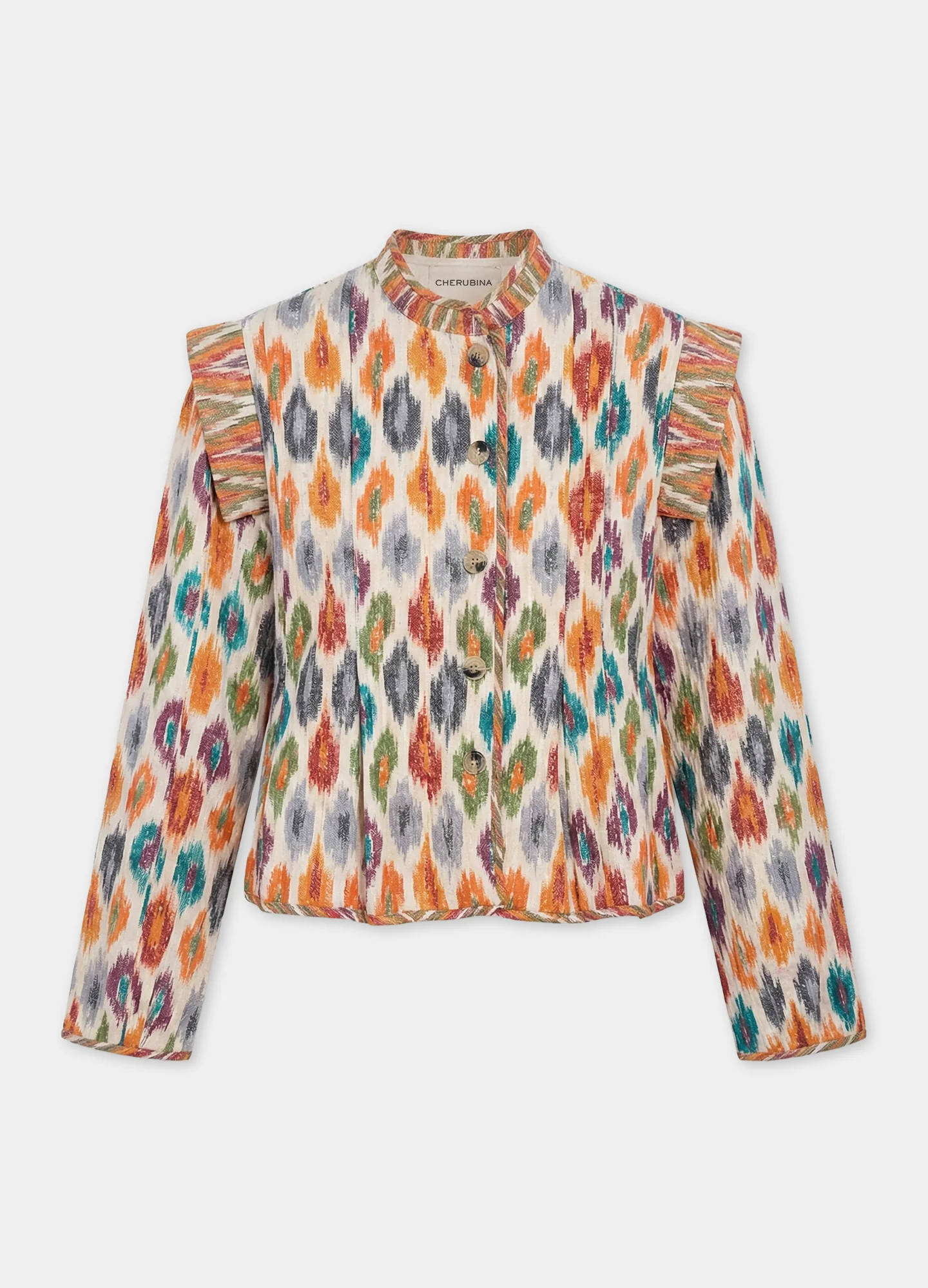 Chaqueta acolchada de corte recto con cuello mao y manga larga. Confeccionada en tejido jacquard artesanal con estampado multicolor. Abertura frontal con botones, fuelles delanteros y traseros, y mangas oversize con detalle en los hombros.