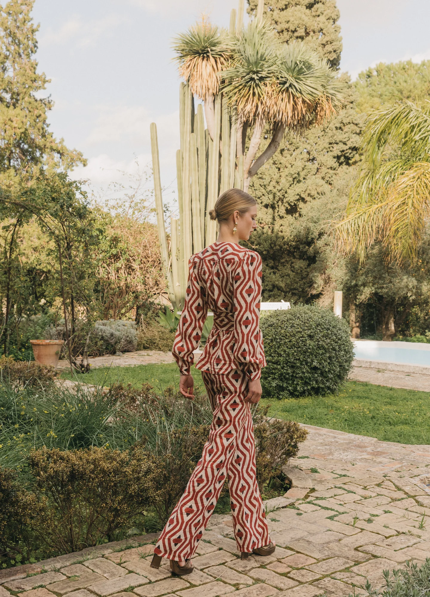 Conjunto formado por el top Nanda estampado de bajo asimétrico y mangas largas ablusadas con puño forrado, cruzado en la cintura con fajín pespunteado, y el pantalón Normanda de tiro alto, pernera ancha y bolsillos decorativos.