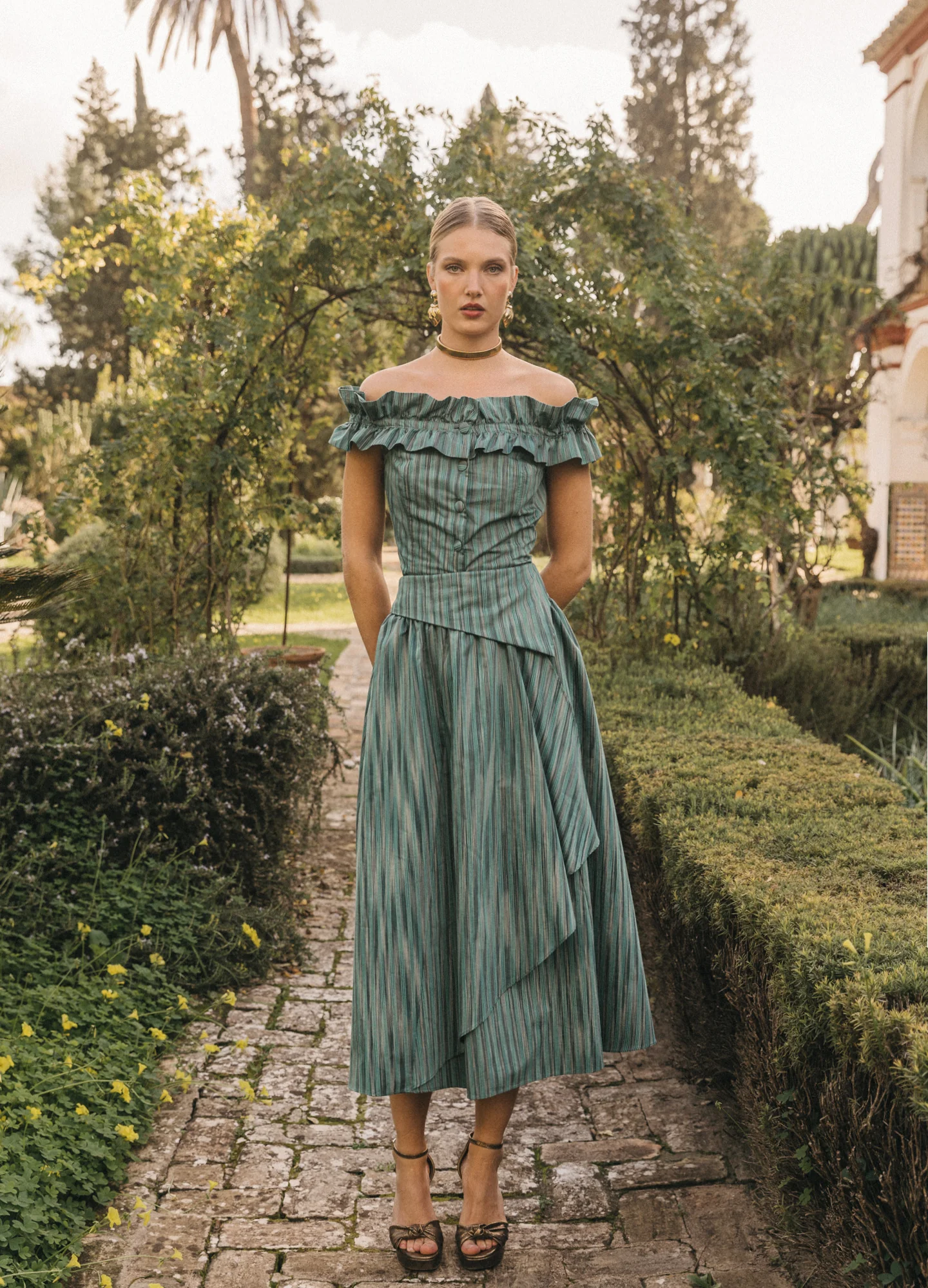 Falda midi de tiro alto con tejido texturizado con rayas finas. Tiene caída fluida con pliegues desde la cintura y un panel delantero superpuesto con drapeado asimétrico. Cinturilla ancha y cierre con cremallera invisible. Perfecta para combinar con el top Celina.