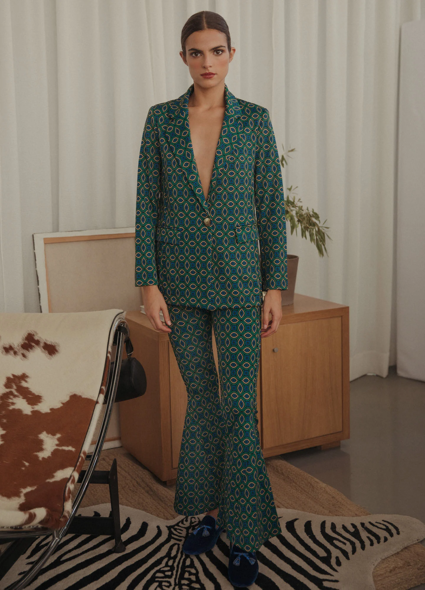 Es un pantalón largo de campana y tiro alto. El bajo del pantalón, desde la rodilla, tiene una pieza en el lateral que se abre para crear el efecto acampanado. Con cinturilla elástica.