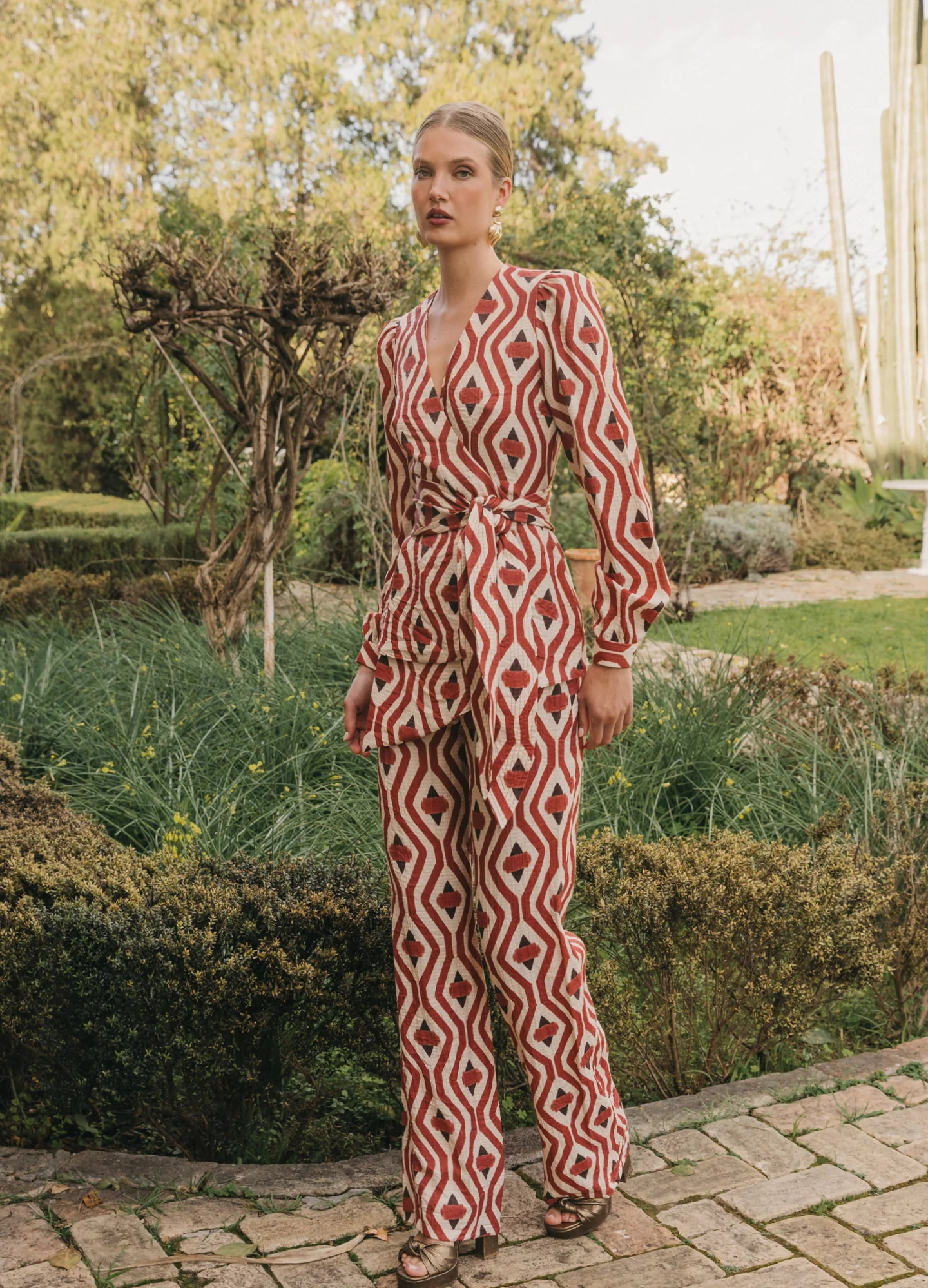 Pantalón estampado de tiro alto y corte recto. Pernera ancha con detalles de bolsillos decorativos en los laterales en contraste. Cierre lateral con cremallera invisible y pliegue en la cinturilla. Combínalo con el top Nanda.