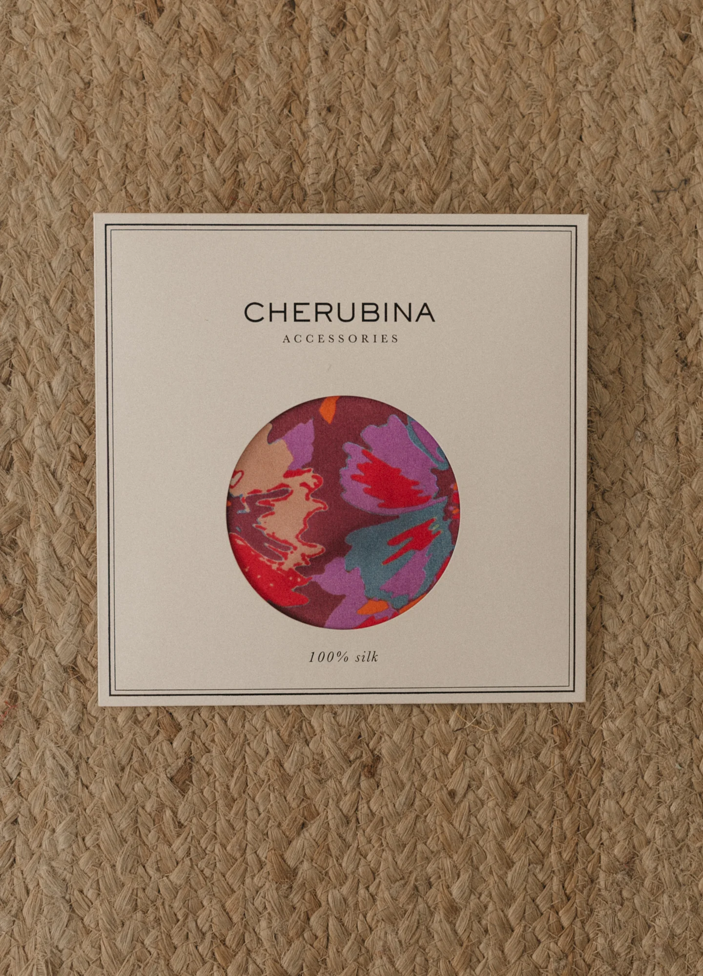 Pañuelo cuadrado elaborado en 100% seda natural. Presenta un estampado de flores abstractas grandes con efecto pincelada, creado a través de un cuidadoso proceso artesanal. Incluye el logo de Cherubina en una de las esquinas.