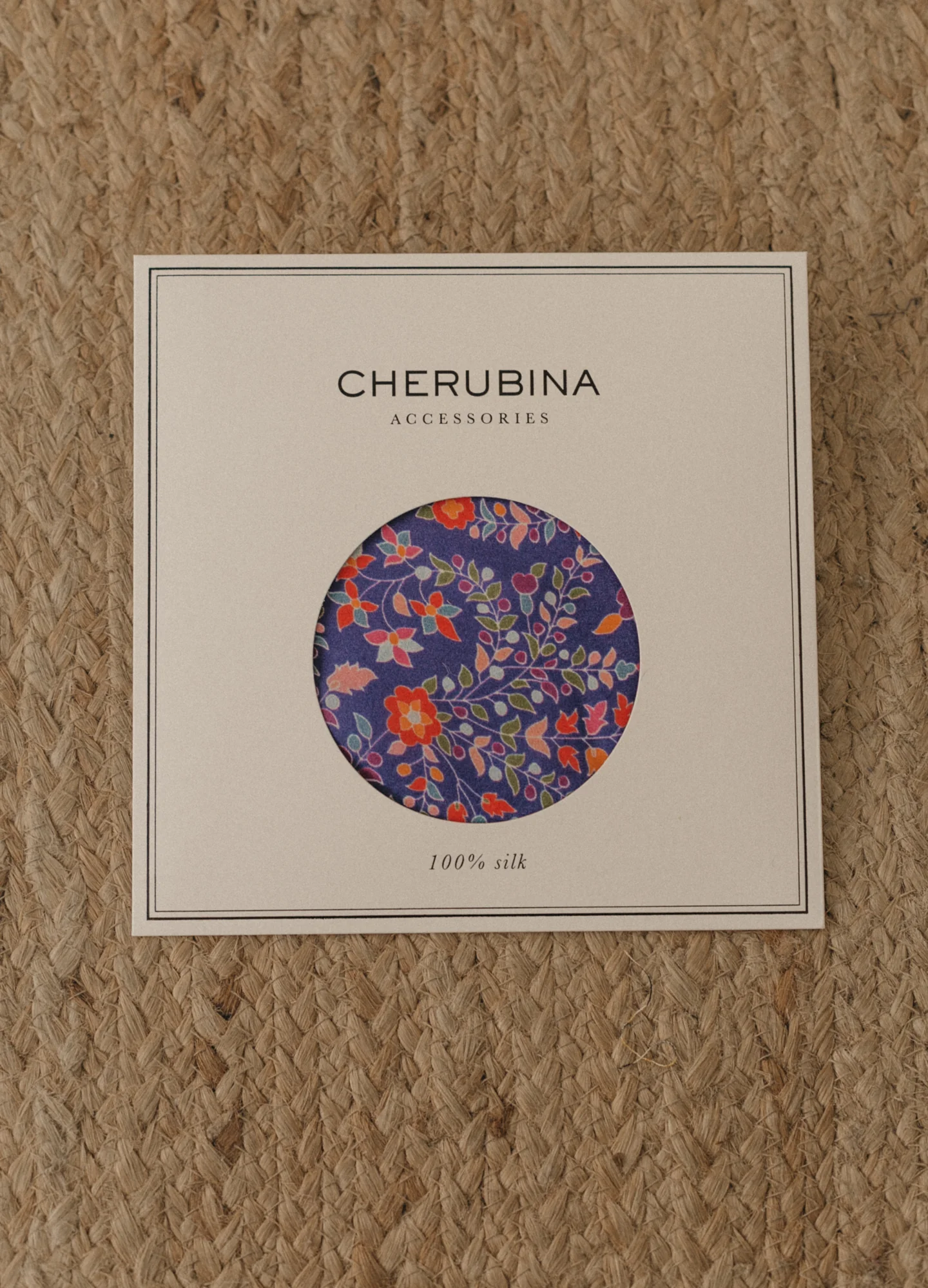 Pañuelo cuadrado elaborado en 100% seda natural. Presenta un estampado de flores pequeñas enmarcadas, creado a través de un cuidadoso proceso artesanal. Incluye el logo de Cherubina en una de las esquinas.