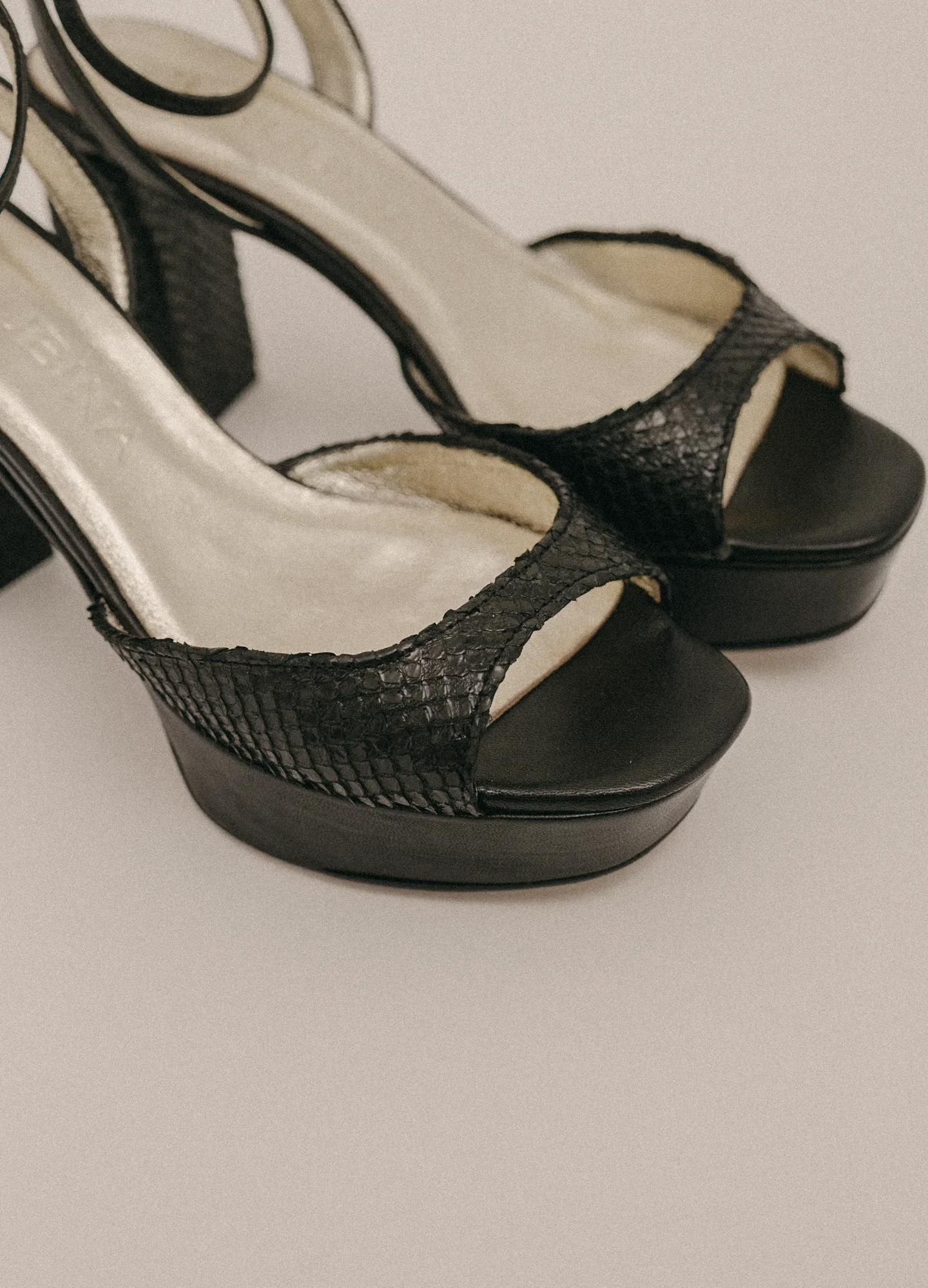 Es una sandalia de tacón con pulsera al tobillo y tres tiras cruzadas en el delantero. Cierre en lateral mediante hebilla metálica. Combina dos texturas de piel. Plantilla memoryfoam para una mayor comodidad. Plataforma de 2'5 cm y tacón de 9 cm.
