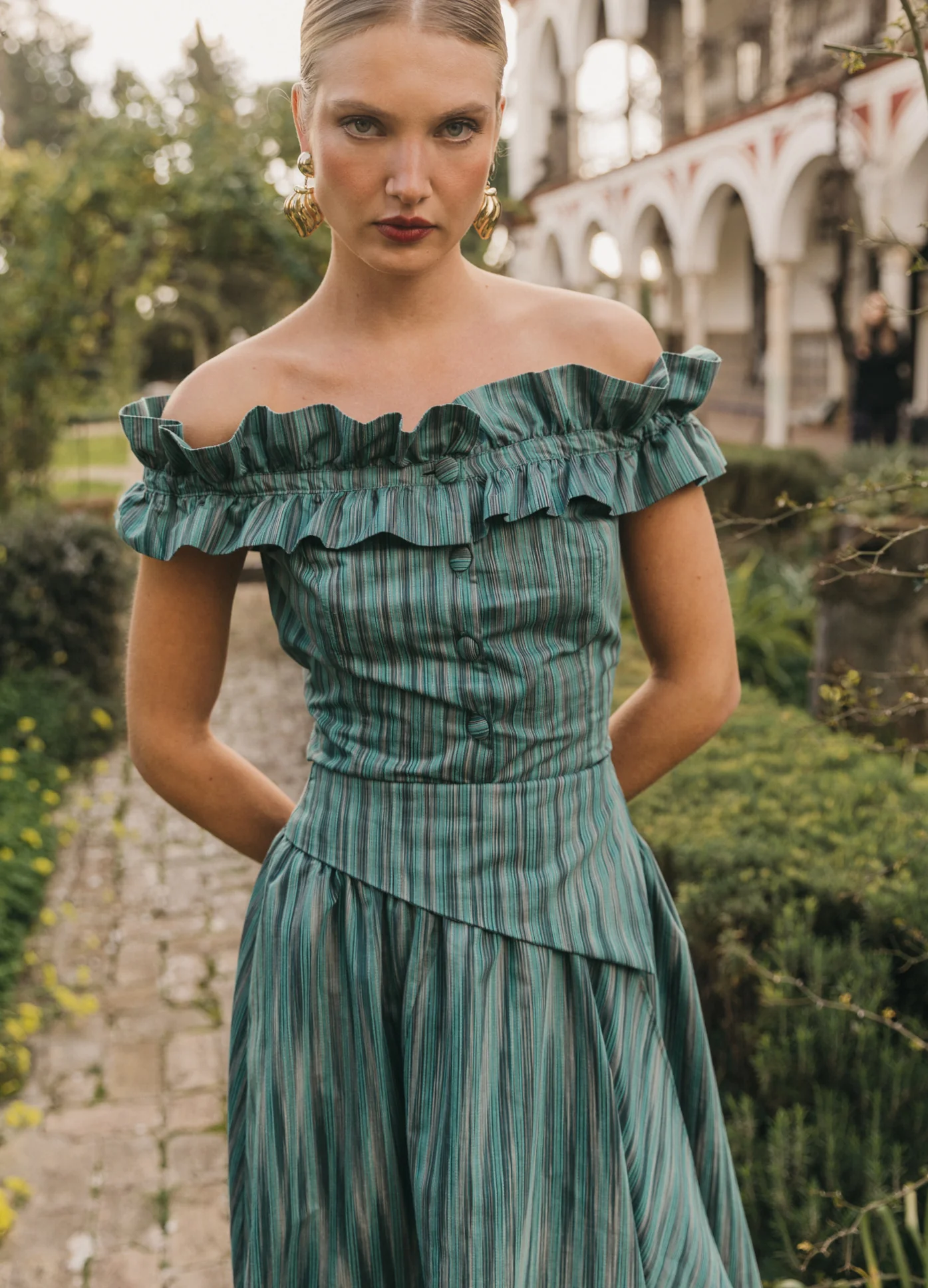 Top en tejido texturizado con rayas finas, estructura tipo corsé y corte a la cintura. Escote bardot con volante fruncido y cierre frontal con botones forrados. Combina con la falda Cameron.