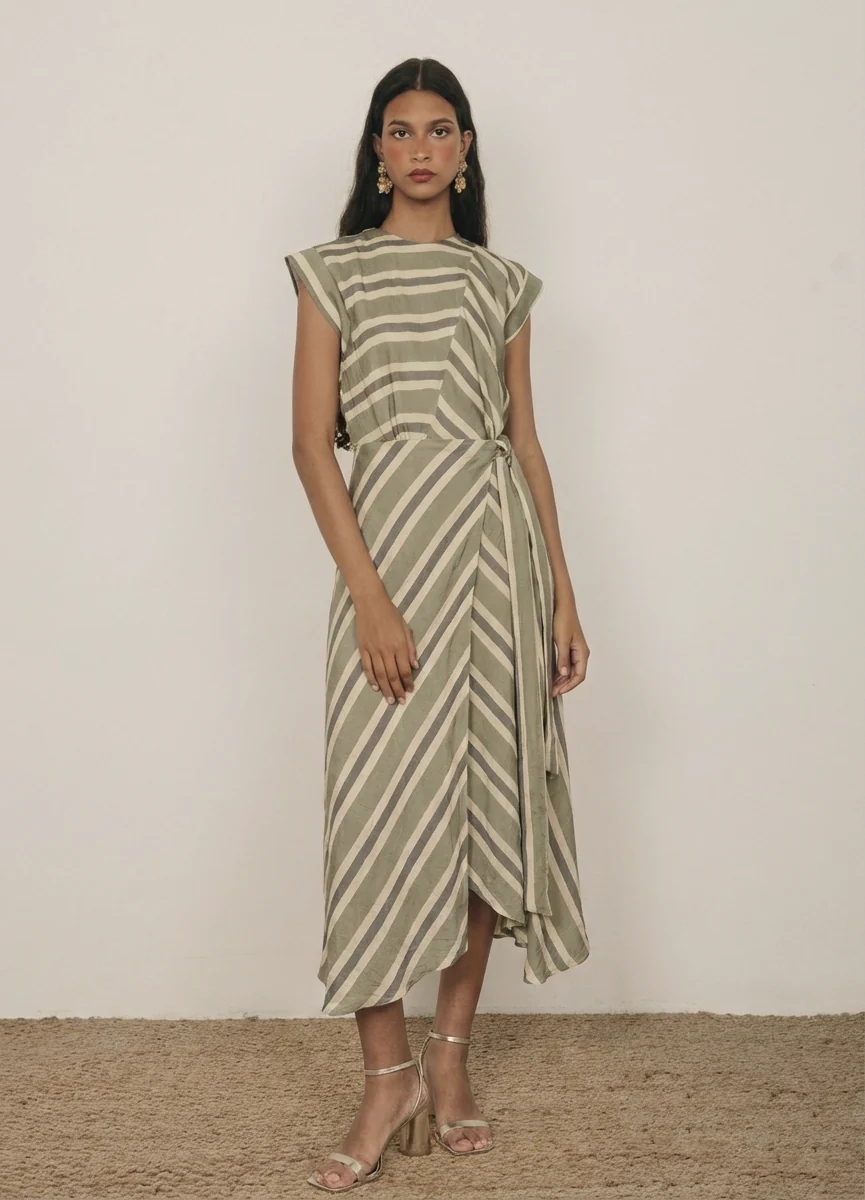 Vestido midi de cuello caja con rayas en distintas direcciones. Falda envolvente, manga caída y cintura definida con lazada lateral. Espalda con botones y discretas aberturas. Diseño elegante y favorecedor, perfecto para eventos y ocasiones especiales.